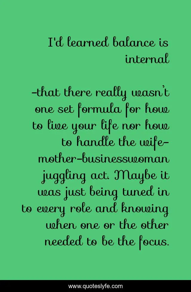 "that there really wasn’t one set formula for how to live your life nor how to handle the wife-mother-businesswoman juggling act. Maybe it was just being tuned in to every role and knowing when one or the other needed to be the focus. Quotes." Quoteslyfe.com, 2025. Fri. 05 Dec. 2025. <https://www.quoteslyfe.com/quote/I-d-learned-balance-is-internal-252236>.
