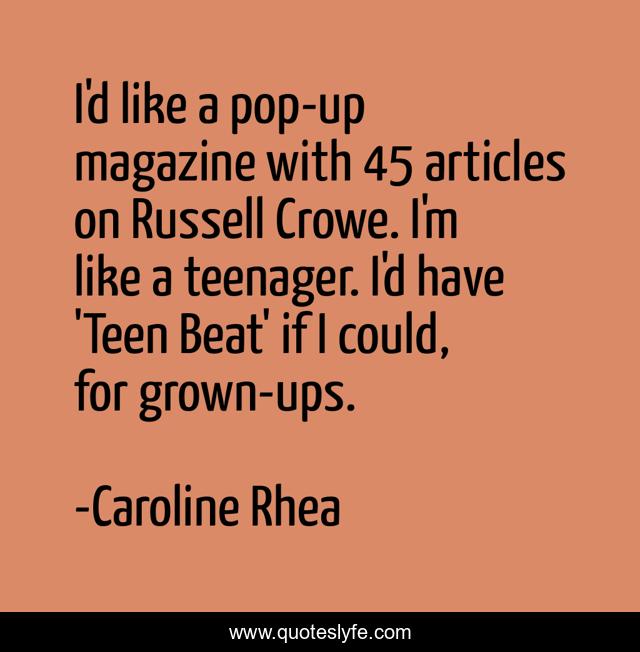 This page presents the quote "I'd like a pop-up magazine with 45 articles on Russell Crowe. I'm like a teenager. I'd have 'Teen Beat' if I could, for grown-ups.". Author of this quote is Caroline Rhea. This quote is about beat, if i could, like,.