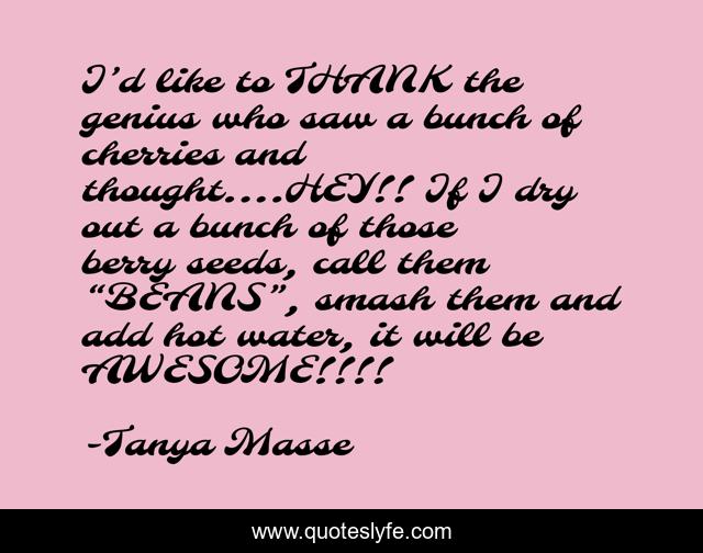This page presents the quote "I’d like to THANK the genius who saw a bunch of cherries and thought....HEY!! If I dry out a bunch of those berry seeds, call them “BEANS”, smash them and add hot water, it will be AWESOME!!!!". Author of this quote is Tanya Masse. This quote is about humorous, coffee, humor, coffee-humor,.
