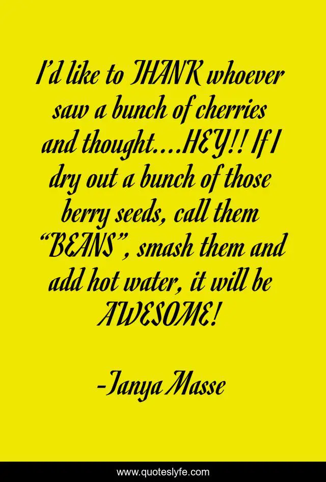 This page presents the quote "I’d like to THANK whoever saw a bunch of cherries and thought....HEY!! If I dry out a bunch of those berry seeds, call them “BEANS”, smash them and add hot water, it will be AWESOME!". Author of this quote is Tanya Masse. This quote is about humorous, coffee, coffee-humor,.