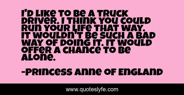 This page presents the quote "I'd like to be a truck driver. I think you could run your life that way. It wouldn't be such a bad way of doing it. It would offer a chance to be alone.". Author of this quote is Princess Anne of England. .