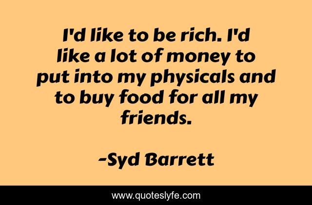 This page presents the quote "I'd like to be rich. I'd like a lot of money to put into my physicals and to buy food for all my friends.". Author of this quote is Syd Barrett. This quote is about money, friends, rich,.