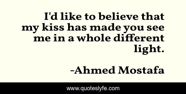 This page presents the quote "I'd like to believe that my kiss has made you see me in a whole different light.". Author of this quote is Ahmed Mostafa. This quote is about love, love-and-sayings, good-kisser, delusional-love, kiss, different-perspective, delusional, self-deception, kissing,.