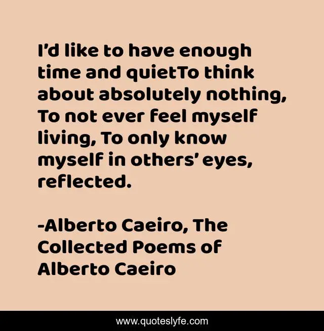 This page presents the quote "I’d like to have enough time and quietTo think about absolutely nothing, To not ever feel myself living, To only know myself in others’ eyes, reflected.". Author of this quote is Alberto Caeiro, The Collected Poems of Alberto Caeiro. This quote is about longing, life, feeling, reflection, others-perspective, solitude, pantheism, reality, meaning,.