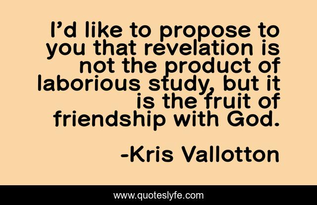 This page presents the quote "I’d like to propose to you that revelation is not the product of laborious study, but it is the fruit of friendship with God.". Author of this quote is Kris Vallotton. This quote is about bethel, love, god, study, jesus, revelation, kris-vallotton, friendship, affection,.