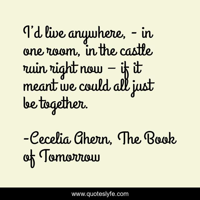 This page presents the quote "I’d live anywhere, - in one room, in the castle ruin right now – if it meant we could all just be together.". Author of this quote is Cecelia Ahern, The Book of Tomorrow. This quote is about love, family, affection,.