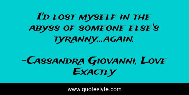 This page presents the quote "I'd lost myself in the abyss of someone else's tyranny...again.". Author of this quote is Cassandra Giovanni, Love Exactly. This quote is about bullying, love, star-crossed-lovers, romance, abuse, abusive-relationships, affection,.