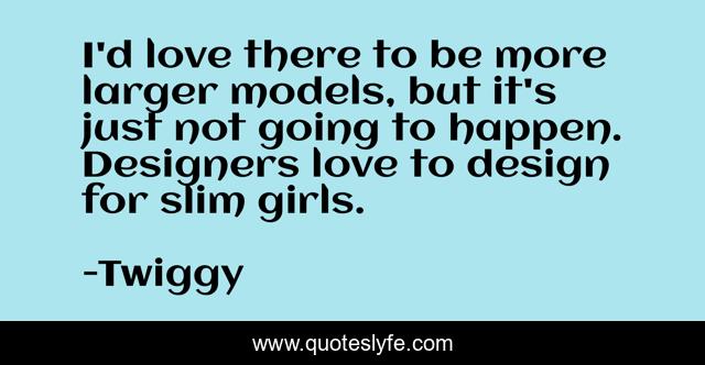 This page presents the quote "I'd love there to be more larger models, but it's just not going to happen. Designers love to design for slim girls.". Author of this quote is Twiggy. This quote is about going, love, just, affection,.