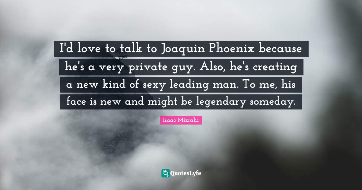 This page presents the quote "I'd love to talk to Joaquin Phoenix because he's a very private guy. Also, he's creating a new kind of sexy leading man. To me, his face is new and might be legendary someday.". Author of this quote is Isaac Mizrahi. This quote is about men, legendary, affection, phoenix, guy, creating, someday, sexy, artist,.