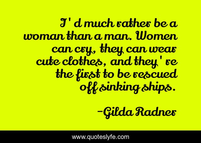 This page presents the quote "I'd much rather be a woman than a man. Women can cry, they can wear cute clothes, and they're the first to be rescued off sinking ships.". Author of this quote is Gilda Radner. This quote is about cute, woman, man,.