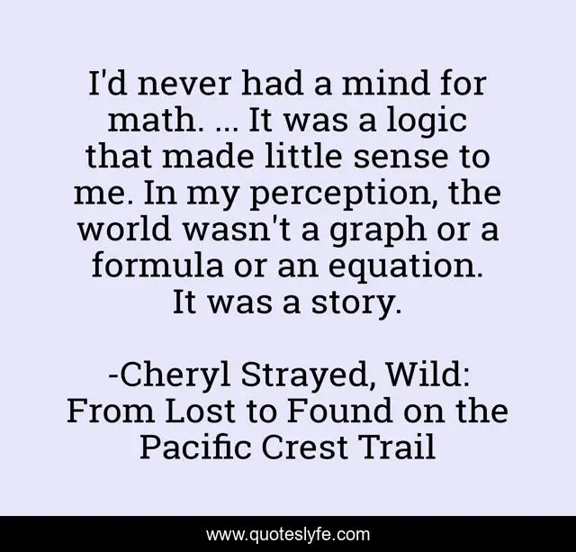 This page presents the quote "I'd never had a mind for math. ... It was a logic that made little sense to me. In my perception, the world wasn't a graph or a formula or an equation. It was a story.". Author of this quote is Cheryl Strayed, Wild: From Lost to Found on the Pacific Crest Trail. This quote is about philosophy-of-life, perspective, narrative,.