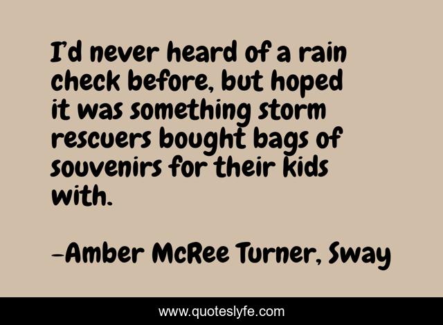 This page presents the quote "I’d never heard of a rain check before, but hoped it was something storm rescuers bought bags of souvenirs for their kids with.". Author of this quote is Amber McRee Turner, Sway. This quote is about storm-rescuers, funny, rain-checks, comedy,.