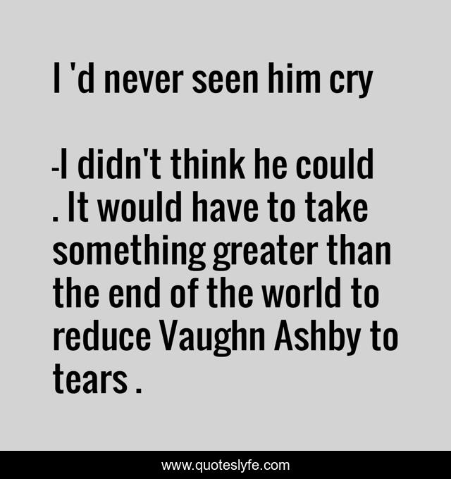 "I didn't think he could . It would have to take something greater than the end of the world to reduce Vaughn Ashby to tears . Quotes." Quoteslyfe.com, 2025. Sat. 06 Dec. 2025. <https://www.quoteslyfe.com/quote/I-d-never-seen-him-cry-148681>.
