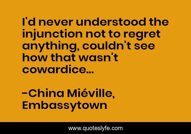 This page presents the quote "I'd never understood the injunction not to regret anything, couldn't see how that wasn't cowardice...". Author of this quote is China Miéville, Embassytown. This quote is about cowardice, injunctions, regret,.