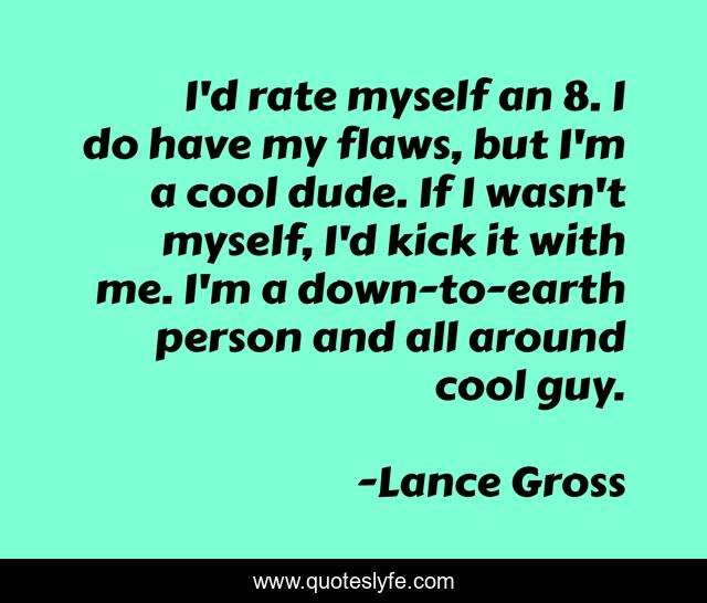 This page presents the quote "I'd rate myself an 8. I do have my flaws, but I'm a cool dude. If I wasn't myself, I'd kick it with me. I'm a down-to-earth person and all around cool guy.". Author of this quote is Lance Gross. This quote is about me, person, myself,.