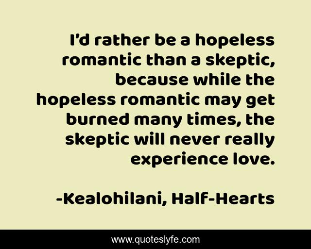 This page presents the quote "I’d rather be a hopeless romantic than a skeptic, because while the hopeless romantic may get burned many times, the skeptic will never really experience love.". Author of this quote is Kealohilani, Half-Hearts. This quote is about love, romantic, hopeless-romantic, advice-for-women, advice, deep, romance, thoughtful, hope,.