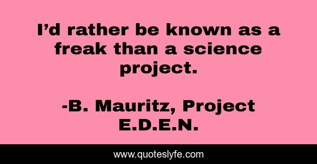 This page presents the quote "I’d rather be known as a freak than a science project.". Author of this quote is B. Mauritz, Project E.D.E.N.. This quote is about humor, young-adult, science-fiction,.