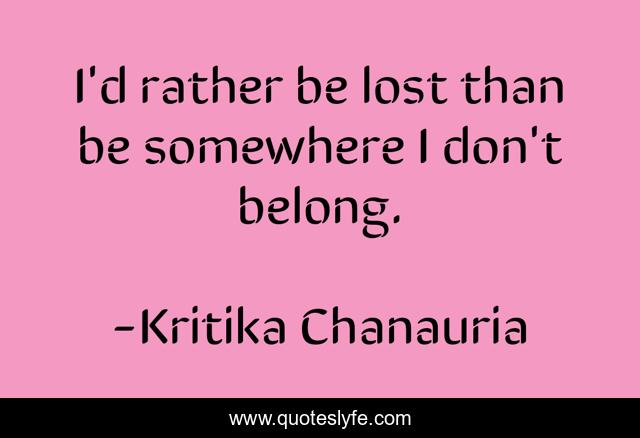 This page presents the quote "I'd rather be lost than be somewhere I don't belong.". Author of this quote is Kritika Chanauria. This quote is about fantasy, belong, confused, lost,.
