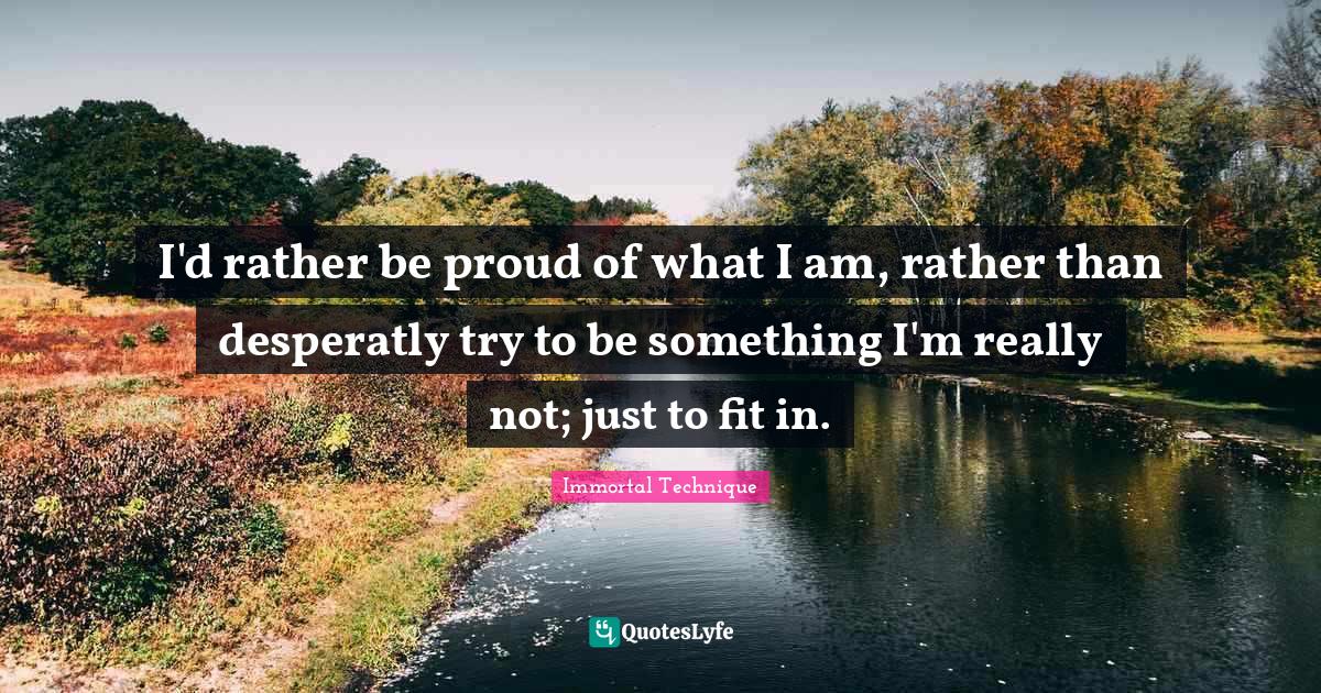 This page presents the quote "I'd rather be proud of what I am, rather than desperatly try to be something I'm really not; just to fit in.". Author of this quote is Immortal Technique. This quote is about proud, technique, fit, be proud, trying,.