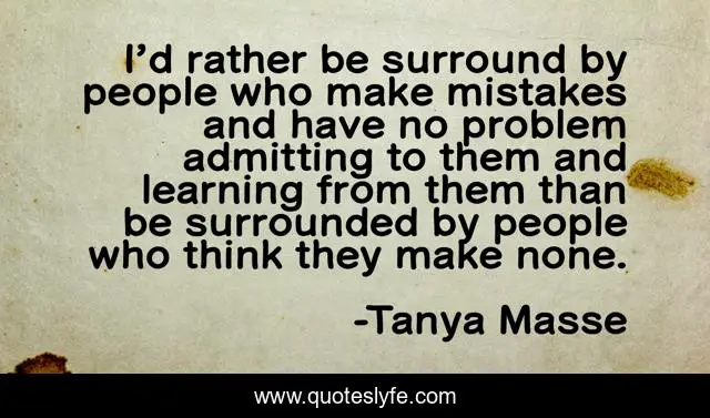 This page presents the quote "I’d rather be surround by people who make mistakes and have no problem admitting to them and learning from them than be surrounded by people who think they make none.". Author of this quote is Tanya Masse. This quote is about quotes-to-live-by, awesome, quotes-by-comic-strip-mama, quotes-about-life,.