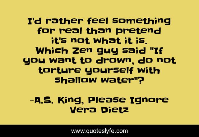 This page presents the quote "I'd rather feel something for real than pretend it's not what it is. Which Zen guy said "If you want to drown, do not torture yourself with shallow water"?". Author of this quote is A.S. King, Please Ignore Vera Dietz. This quote is about great-story, teenage, young-adult-fiction, young-adult, awesome-book,.
