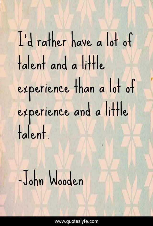 This page presents the quote "I'd rather have a lot of talent and a little experience than a lot of experience and a little talent.". Author of this quote is John Wooden. This quote is about rather, little, talent,.