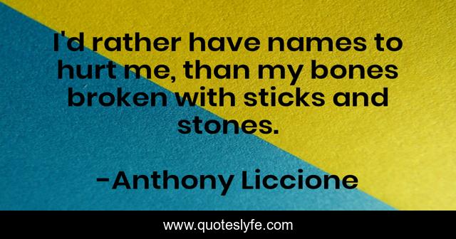 This page presents the quote "I'd rather have names to hurt me, than my bones broken with sticks and stones.". Author of this quote is Anthony Liccione. This quote is about bones, broken, hurt, sticks-and-stones,.