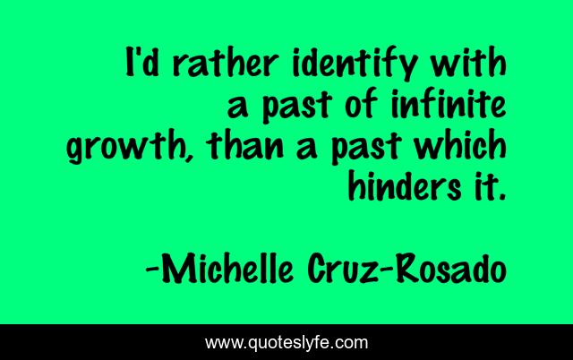 This page presents the quote "I'd rather identify with a past of infinite growth, than a past which hinders it.". Author of this quote is Michelle Cruz-Rosado. This quote is about positive, confidence, motivational, optimistic,.