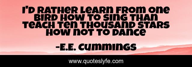 This page presents the quote "I'd rather learn from one bird how to sing than teach ten thousand stars how not to dance". Author of this quote is E.E. Cummings. This quote is about constructive-living, enthusiasm, inspirational,.