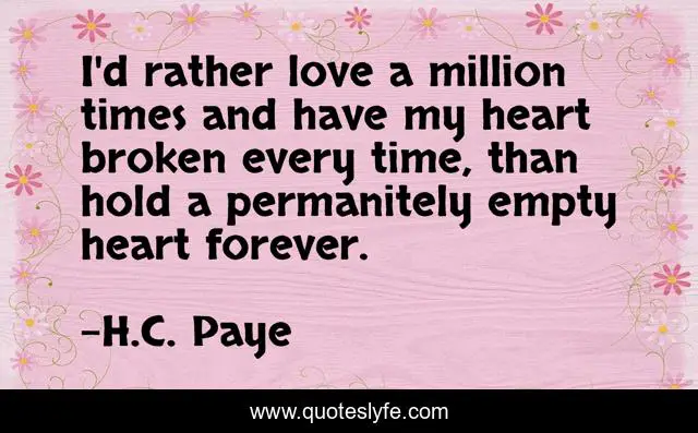 This page presents the quote "I'd rather love a million times and have my heart broken every time, than hold a permanitely empty heart forever.". Author of this quote is H.C. Paye. This quote is about broken-heart, love, million, alone, empty, not, affection,.