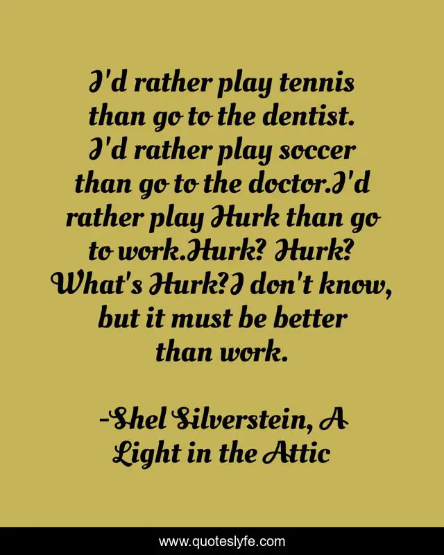 This page presents the quote "I'd rather play tennis than go to the dentist. I'd rather play soccer than go to the doctor.I'd rather play Hurk than go to work.Hurk? Hurk? What's Hurk?I don't know, but it must be better than work.". Author of this quote is Shel Silverstein, A Light in the Attic. This quote is about hurk, poem, work,.
