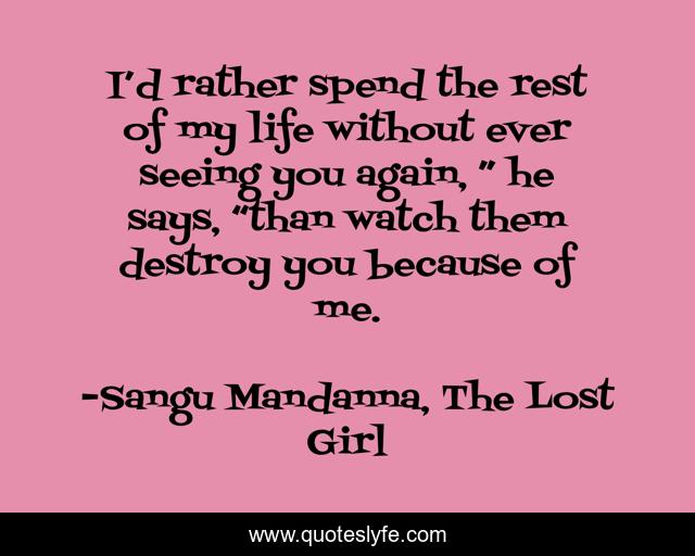This page presents the quote "I’d rather spend the rest of my life without ever seeing you again, ” he says, “than watch them destroy you because of me.". Author of this quote is Sangu Mandanna, The Lost Girl. This quote is about sacrifice, love, separation, affection,.