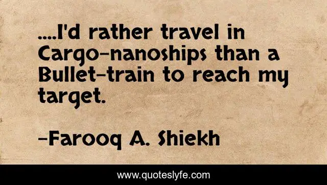 This page presents the quote "....I'd rather travel in Cargo-nanoships than a Bullet-train to reach my target.". Author of this quote is Farooq A. Shiekh. This quote is about difficult-target, love, hard-work, dauntless, humorous, complex-target, impossible, funny-humor, competition,.