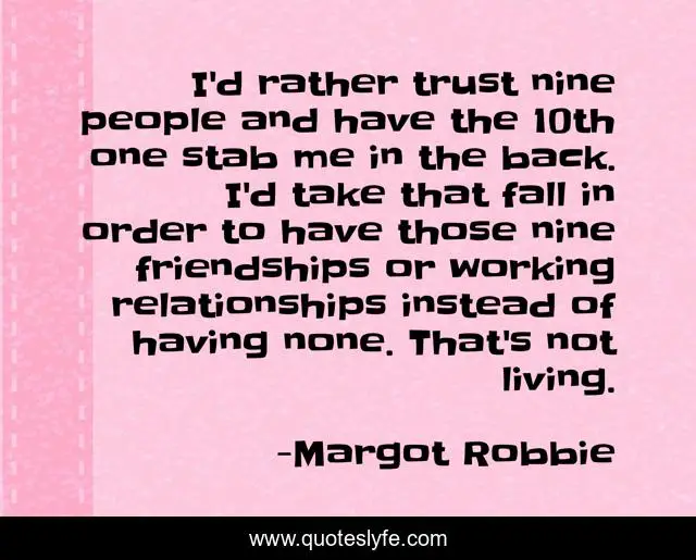This page presents the quote "I'd rather trust nine people and have the 10th one stab me in the back. I'd take that fall in order to have those nine friendships or working relationships instead of having none. That's not living.". Author of this quote is Margot Robbie. This quote is about me, people, fall,.