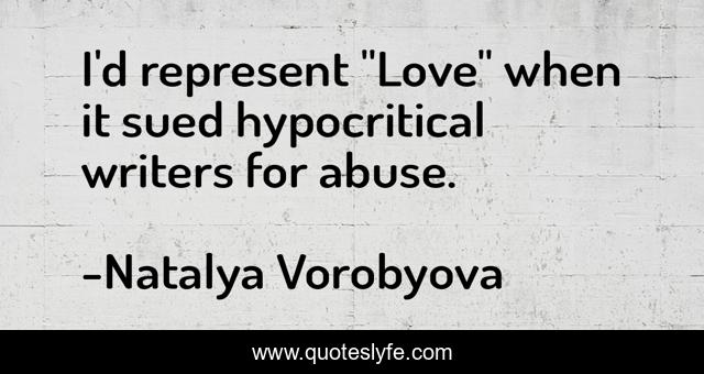 This page presents the quote "I'd represent "Love" when it sued hypocritical writers for abuse.". Author of this quote is Natalya Vorobyova. This quote is about case, represent, court, hypocrisy, abuse, writers, lawyer, hypocrites, love,.