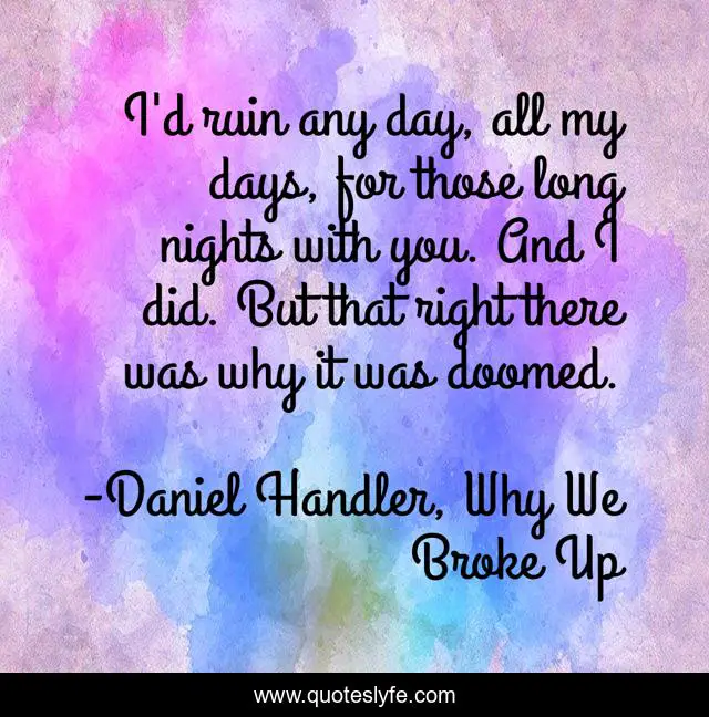This page presents the quote "I'd ruin any day, all my days, for those long nights with you. And I did. But that right there was why it was doomed.". Author of this quote is Daniel Handler, Why We Broke Up. This quote is about heartbreak, love, lovers, affection,.
