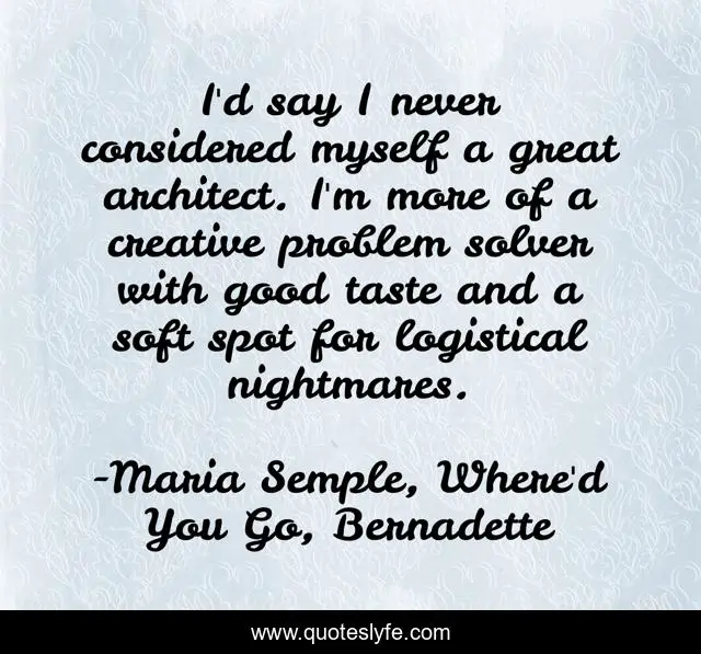 This page presents the quote "I'd say I never considered myself a great architect. I'm more of a creative problem solver with good taste and a soft spot for logistical nightmares.". Author of this quote is Maria Semple, Where'd You Go, Bernadette. .