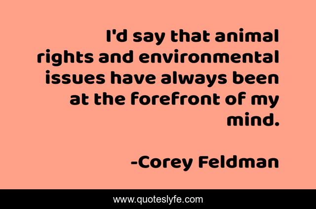 This page presents the quote "I'd say that animal rights and environmental issues have always been at the forefront of my mind.". Author of this quote is Corey Feldman. This quote is about mind, animal, rights,.