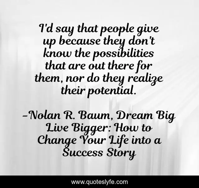 This page presents the quote "I'd say that people give up because they don't know the possibilities that are out there for them, nor do they realize their potential.". Author of this quote is Nolan R. Baum, Dream Big Live Bigger: How to Change Your Life into a Success Story. This quote is about confidence, positive, motivational, optimistic, inspirational, enthusiasm,.