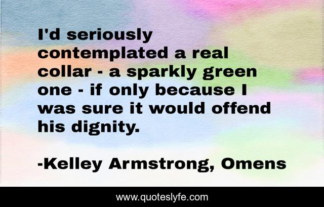 This page presents the quote "I'd seriously contemplated a real collar - a sparkly green one - if only because I was sure it would offend his dignity.". Author of this quote is Kelley Armstrong, Omens. This quote is about dignity, humor, olivia, collar, cat,.