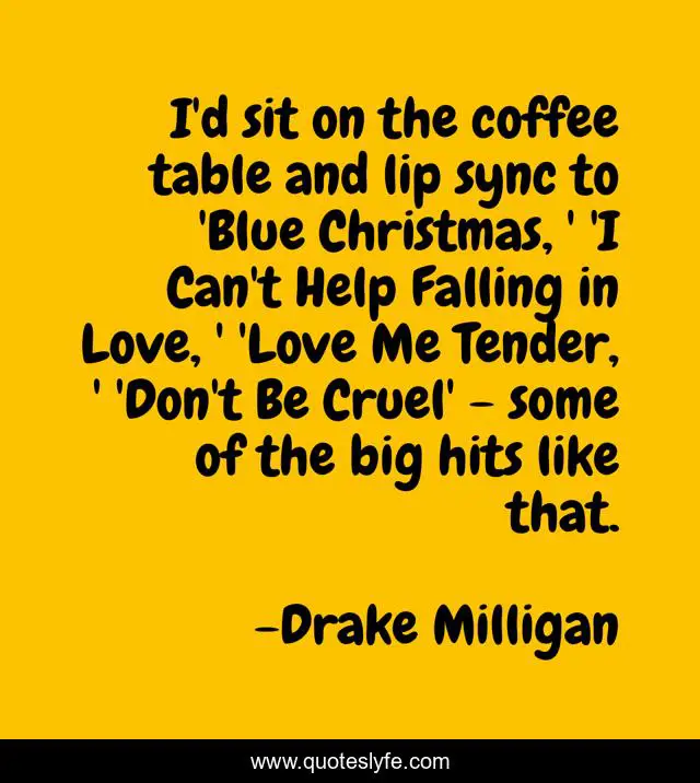 This page presents the quote "I'd sit on the coffee table and lip sync to 'Blue Christmas, ' 'I Can't Help Falling in Love, ' 'Love Me Tender, ' 'Don't Be Cruel' - some of the big hits like that.". Author of this quote is Drake Milligan. This quote is about blue, coffee, love, affection,.