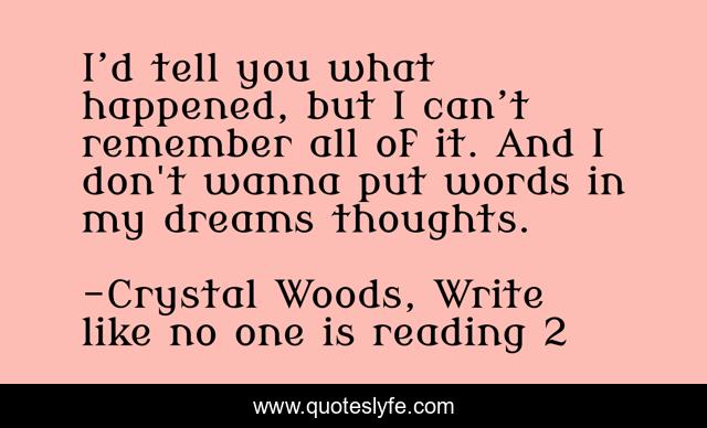 This page presents the quote "I’d tell you what happened, but I can’t remember all of it. And I don't wanna put words in my dreams thoughts.". Author of this quote is Crystal Woods, Write like no one is reading 2. This quote is about recall, quotes-about-dreams, thoughts, words, dreaming, inner-dialogue, dreams,.
