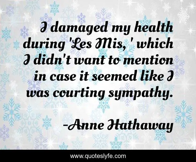 This page presents the quote "I damaged my health during 'Les Mis, ' which I didn't want to mention in case it seemed like I was courting sympathy.". Author of this quote is Anne Hathaway. This quote is about health, like,.