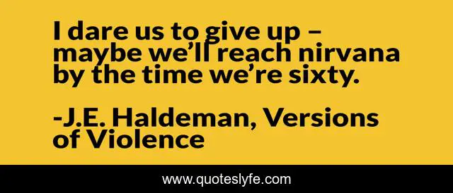 This page presents the quote "I dare us to give up – maybe we’ll reach nirvana by the time we’re sixty.". Author of this quote is J.E. Haldeman, Versions of Violence. This quote is about excluded-chapters, lightning, nirvana, book, silly, sixty, lily,.