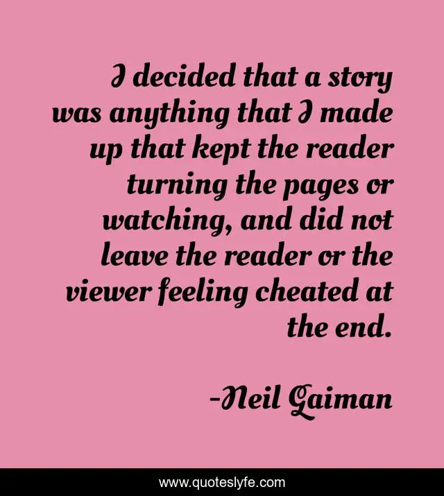 This page presents the quote "I decided that a story was anything that I made up that kept the reader turning the pages or watching, and did not leave the reader or the viewer feeling cheated at the end.". Author of this quote is Neil Gaiman. This quote is about story, writing,.