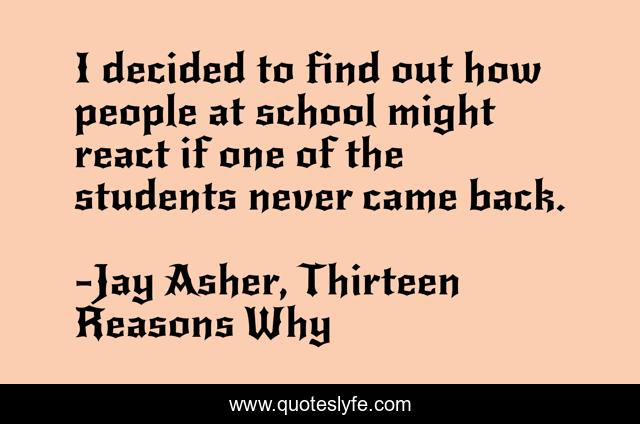 This page presents the quote "I decided to find out how people at school might react if one of the students never came back.". Author of this quote is Jay Asher, Thirteen Reasons Why. .