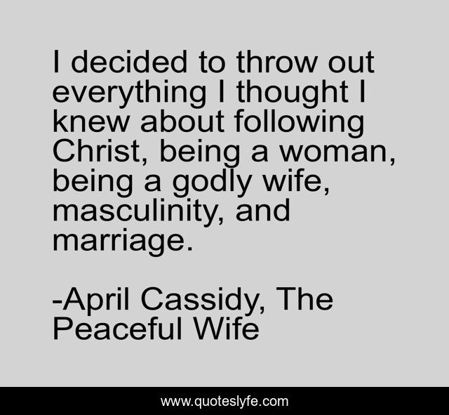 This page presents the quote "I decided to throw out everything I thought I knew about following Christ, being a woman, being a godly wife, masculinity, and marriage.". Author of this quote is April Cassidy, The Peaceful Wife. This quote is about christian-faith, christian-lifefe, christian, christian-living, christianity,.
