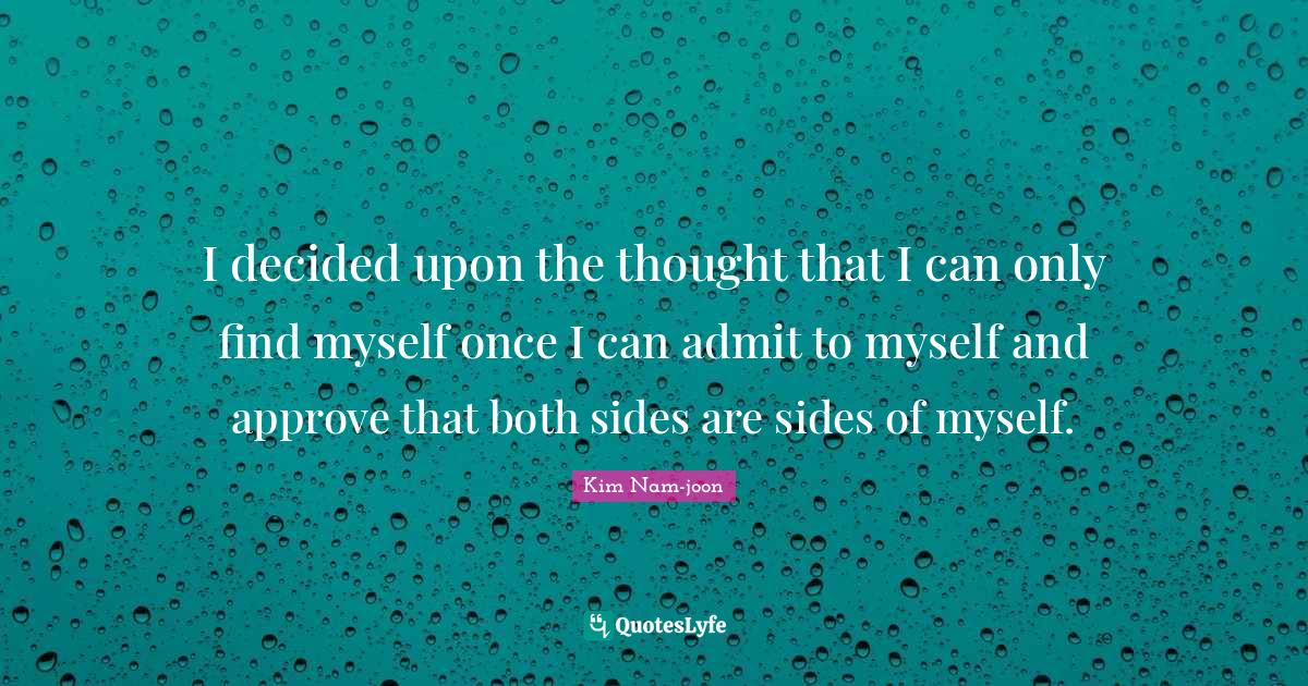 This page presents the quote "I decided upon the thought that I can only find myself once I can admit to myself and approve that both sides are sides of myself.". Author of this quote is Kim Nam-joon. This quote is about both sides, decided, sides, i can,.