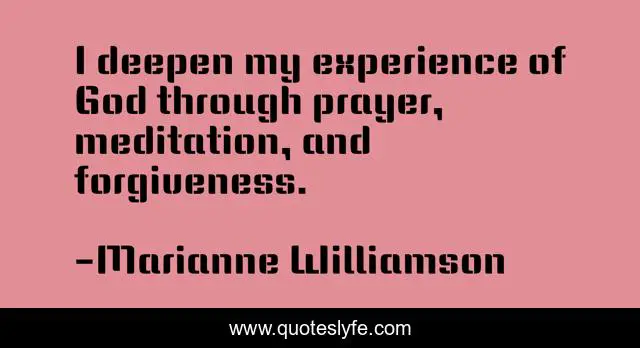 This page presents the quote "I deepen my experience of God through prayer, meditation, and forgiveness.". Author of this quote is Marianne Williamson. This quote is about god, forgiveness, prayer,.