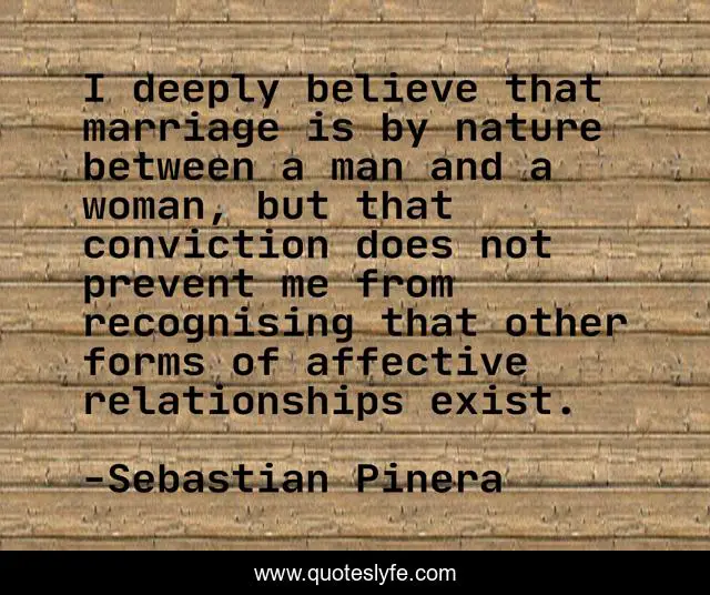 This page presents the quote "I deeply believe that marriage is by nature between a man and a woman, but that conviction does not prevent me from recognising that other forms of affective relationships exist.". Author of this quote is Sebastian Pinera. This quote is about woman, nature, man,.